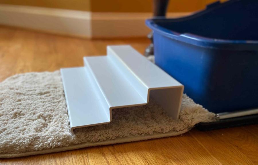 Simply place the steps on a non-slip rug or mat in front of your cat’s normal access point for his litter box. The rug or mat helps keep the steps from sliding and has the added benefit of capturing some of the inevitable litter residue as your cat exits the box.